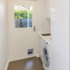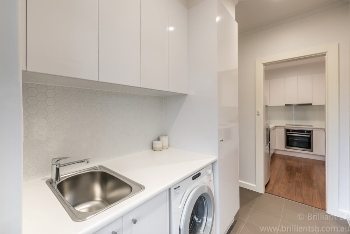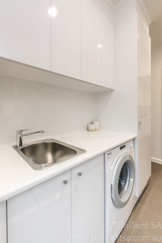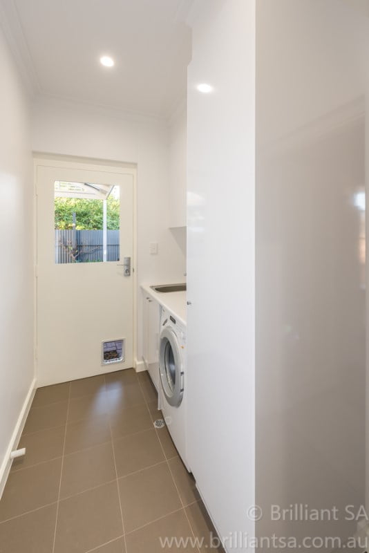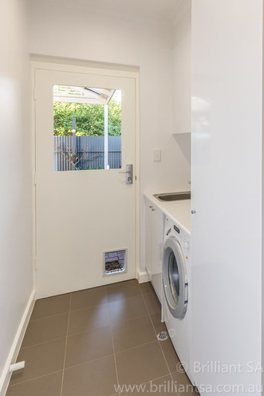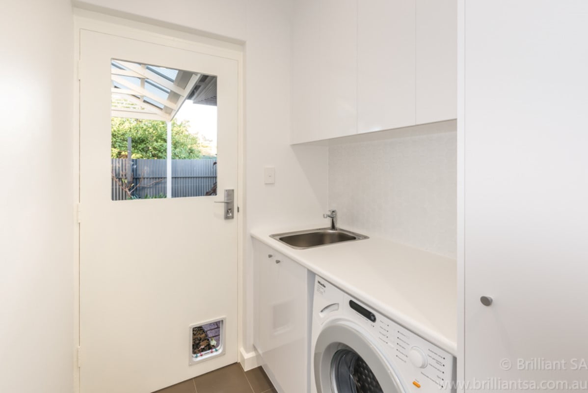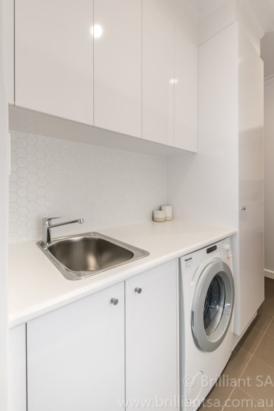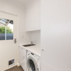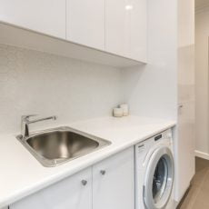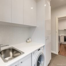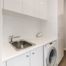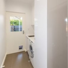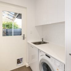 The existing dark timber joinery closed in the already small kitchen. To aid in making the room feel more spacious white joinery, bench tops and splash backs were selected. Tall cabinetry was placed on the opposite wall to open up the kitchen and allow for a seating area. The doorway opening was decreased to ensure the fridge did not protrude into the walkway. New LED downlights were installed and the old cumbersome window was replaced to complete this transformation.