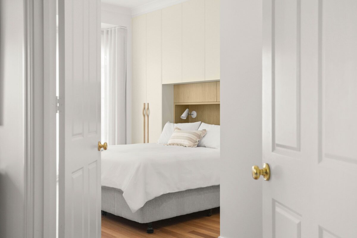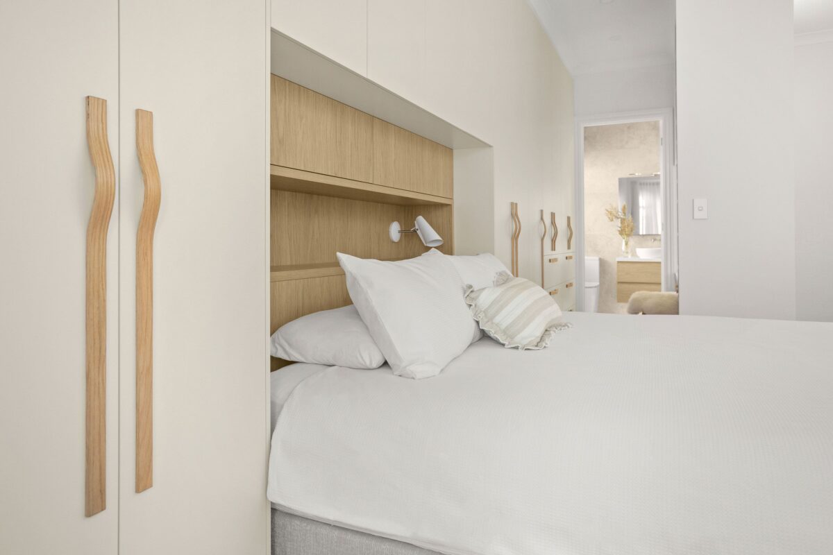 Our designer started by improving the layout for an easier transition between spaces and creating a wide turning circle space for future wheelchair/walker use. Consequently, we removed an existing non-load-bearing wall in the walk-in robe and repositioned the ensuite door.