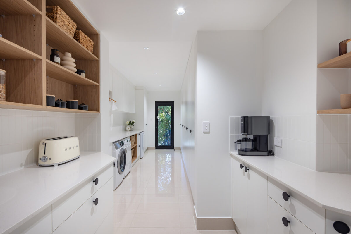 Each zone serves a distinct purpose. We designed a galley-style scullery, positioned beside the kitchen, that includes generous bench space, a secondary sink, open shelving for pantry staples, and some LED strip task lighting beneath the overhead cupboards. Power points were added along the benchtop for appliances, with a corner set aside for the daily coffee routine.